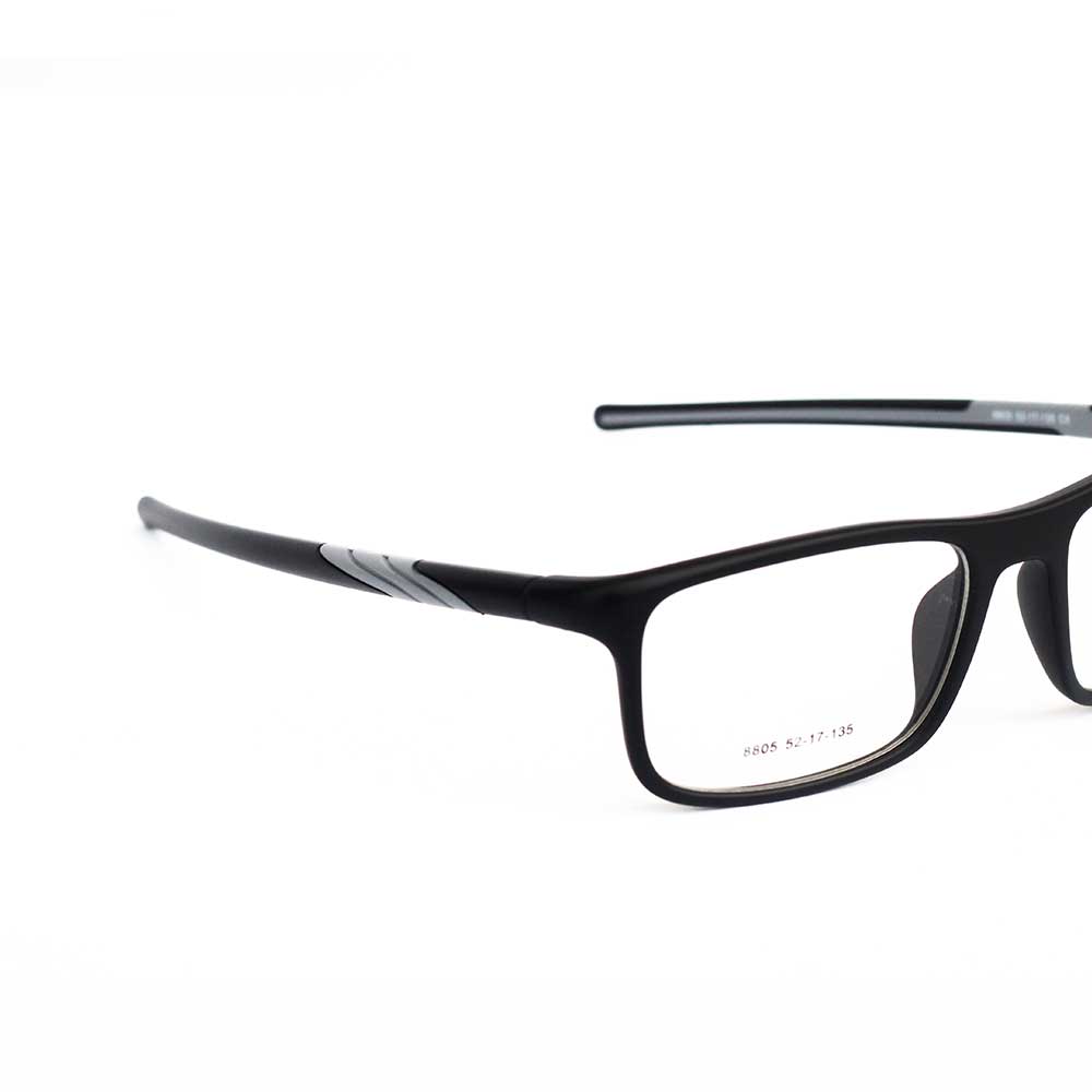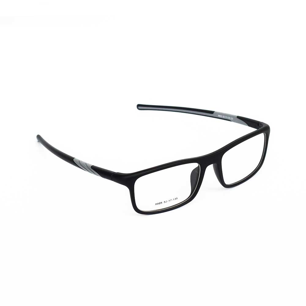 | NAME: MR.AINAK, MODEL NO: 8805, SIZE: 52-17-135, FRAME COLOUR: MATT BLACK & GREY, LENSE COLOUR: TRANSPARENT, MATERIAL: TR, CATEGORY: UNISEX |